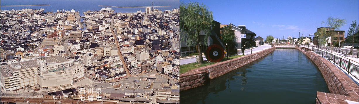 かつて、七尾城が城山にあった頃、港とまちと城とを結ぶ小運河が御祓川を中心に建設されました。川沿いには市がたち、買い物客で賑わったことでしょう。