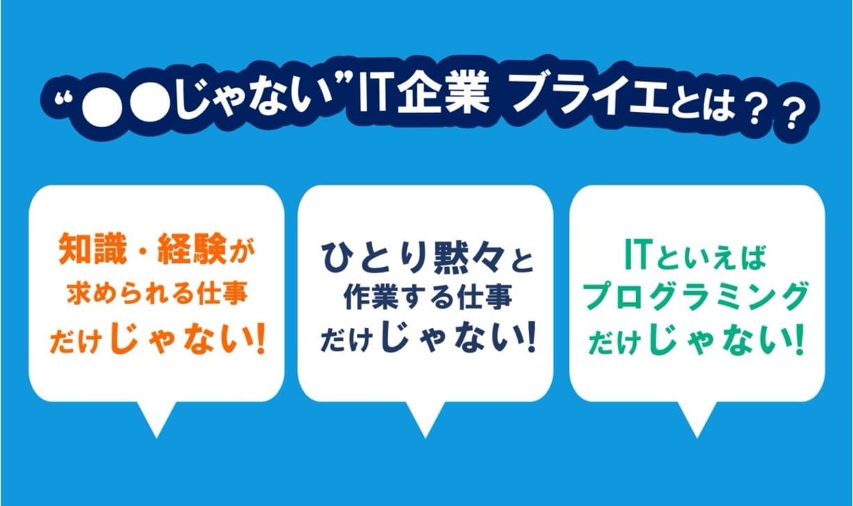 株式会社ブライエは設立以来40年、大手企業を中心に、IT環境の設計・導入から運用・管理にいたるまで、幅広いITサポートを行ってきました。 今後の事業の拡大を見据え人財を募集しています。