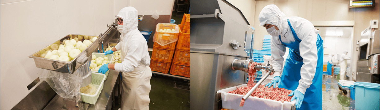 弊社工場内でのお仕事です。バンドソーやスライサー等の機械を使い、食肉のカットやスライス、ミンチを行います。また、大釜やコンベクションオーブンを使った調理等も行います。
