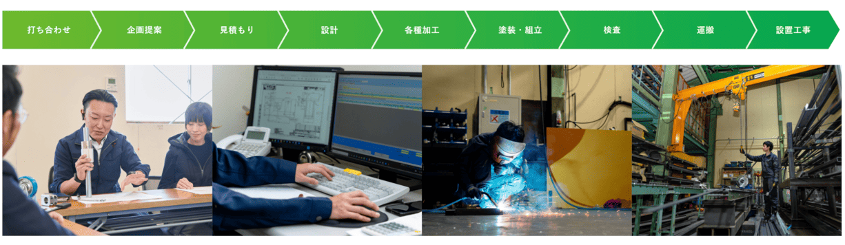 お客さまのご要望を聞き、それを設計に反映し、製品として形にし、必要に応じて取り付け工事をするといった一貫生産体制を確立しています。