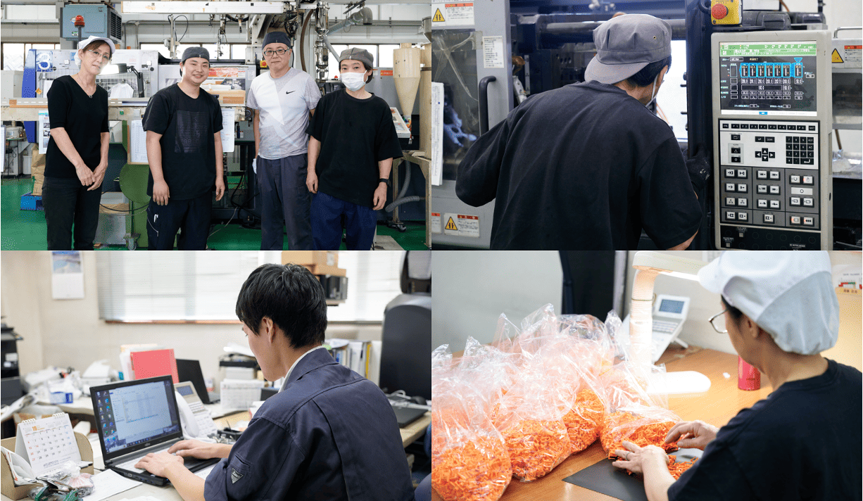 工場内でプラスチック製品の製造の仕事です。当社は射出成形機を用いてプラスチック製品を作っています。主な仕事内容は機械の操作や設定になります。当社に入社する多くの方が未経験者なので、ご安心ください。