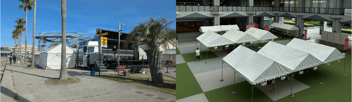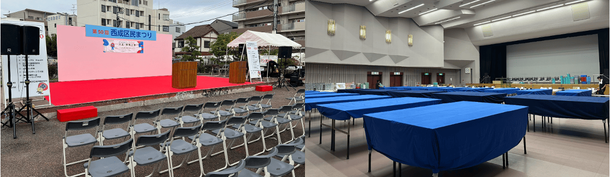 イベントステージを組んだり、テントを建てたり、備品を配ったりします。