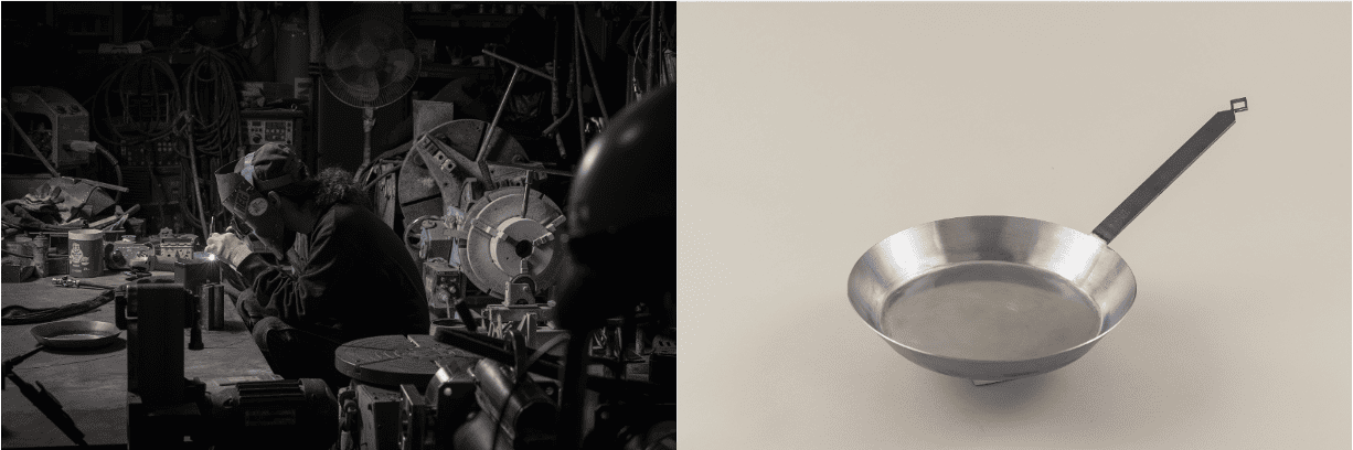 フライパンに関しましては、「焼き面とフチの厚さや・鉄の材質を変え」・フライパンのフチの部分は機械を使用し手作業にて曲げ・焼面・フチ・持ち手の部分を溶接にて加工し形が出来上がります。