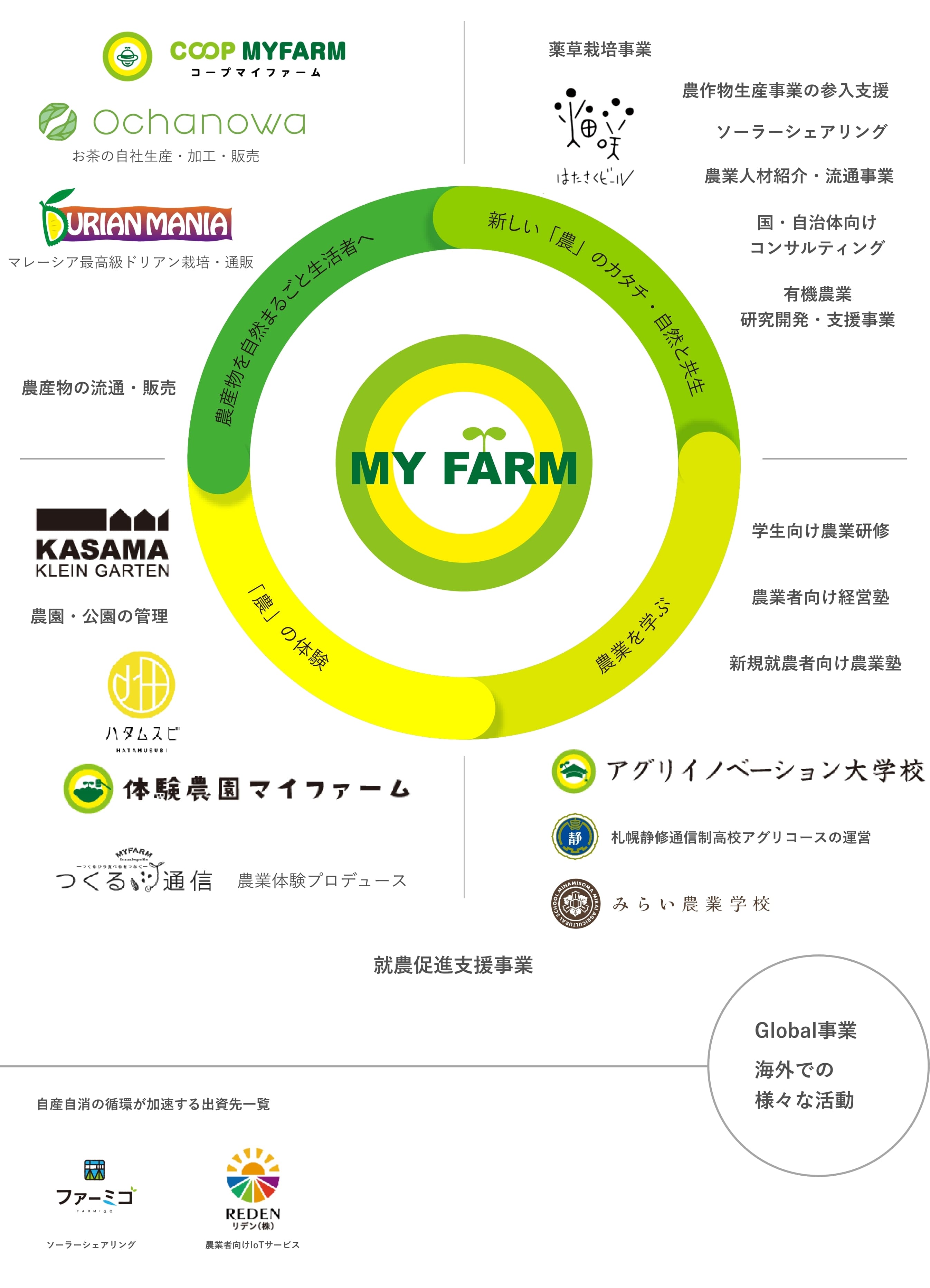 耕作放棄地解消のための新たな営農モデルに挑戦するマイファームの直営農場や、農業技術の知見とノウハウを生かした技術的支援など、農の新たな「コト」を追求する事業です。
