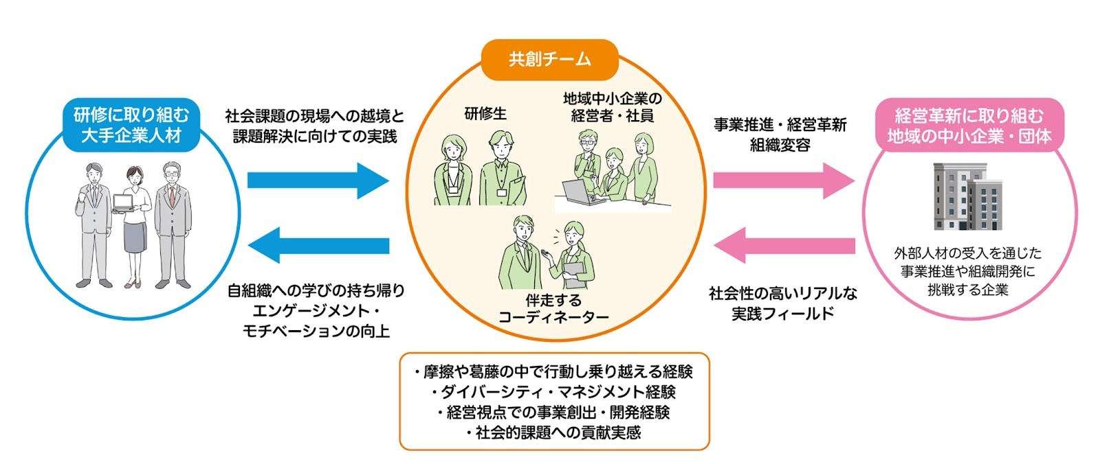 大手企業社員等がチームを組んで地域課題解決、地域創生の現場に越境し、新たなイノベーション創出に取り組むことで、人材の成長と地域課題解決を両立することができます。