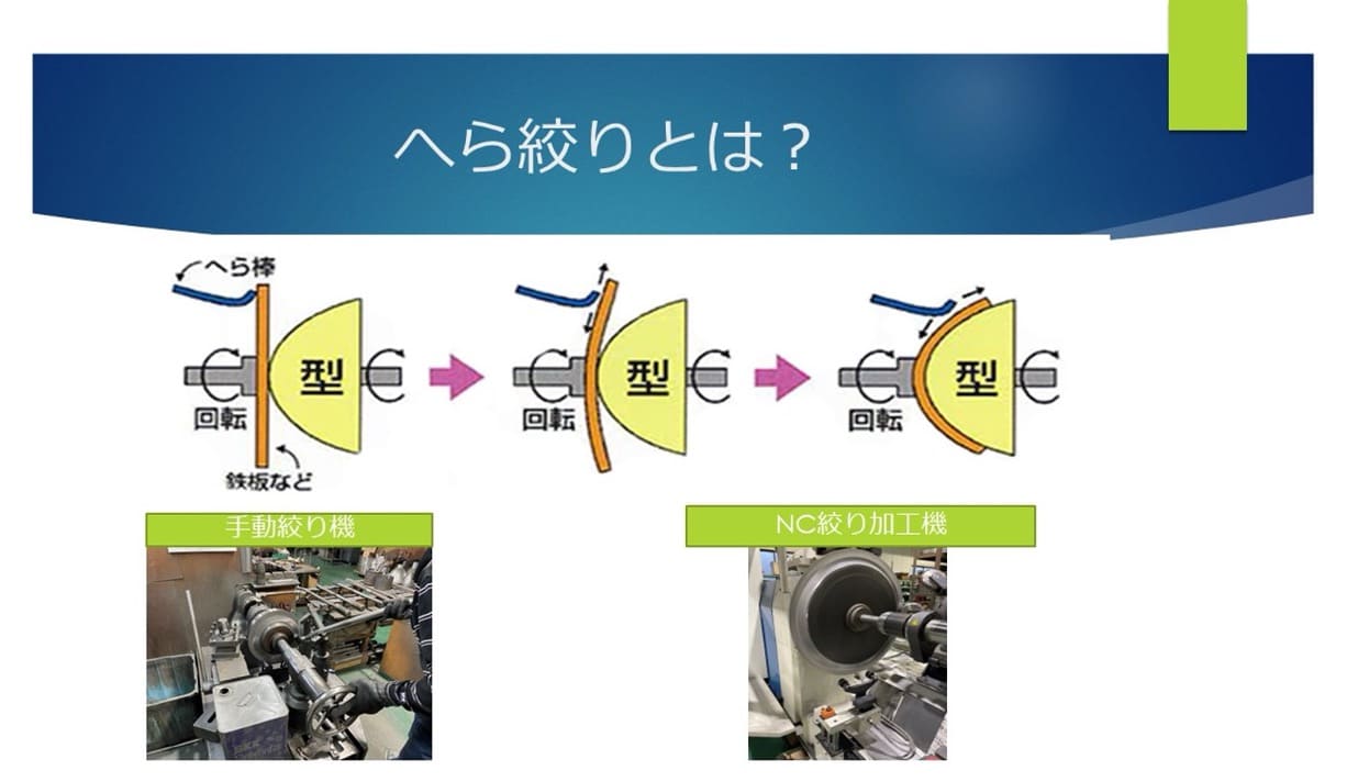 へら絞りは、平面状あるいは円筒状の金属板を回転させながら、へらと呼ばれる棒を押し当てて少しずつ変形させる塑性加工の手法でありスピニング加工とも呼ばれます。