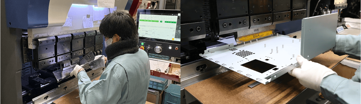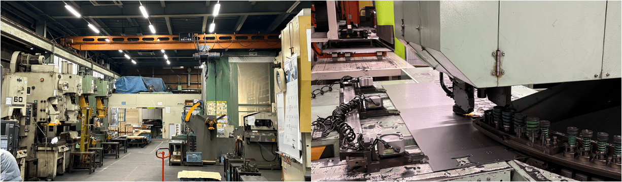 金属プレス機械及びNCパンチ・レーザ機械を駆使し、鉄板を抜いたり曲げたりすることでコンピュータ、スキャナー・プリンター機などに使われる板金部品を作っています。