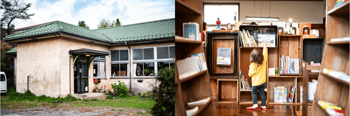 合併前の旧村立図書館として建設され、合併後は町立図書館の分館として利用されていた町有施設です。現在は、本屋・私設図書館・オフィスの複合施設として再活用されています。
