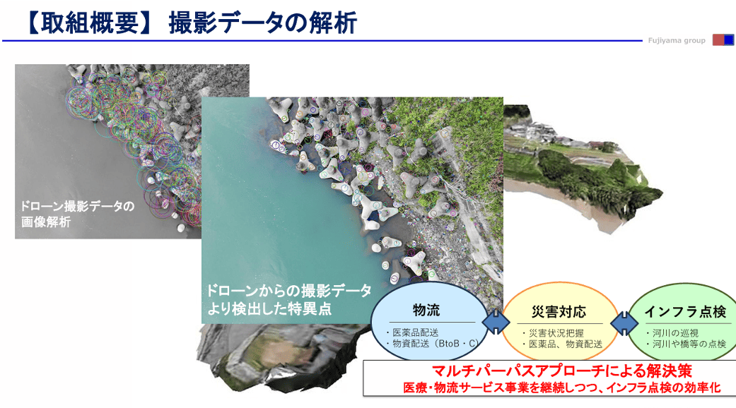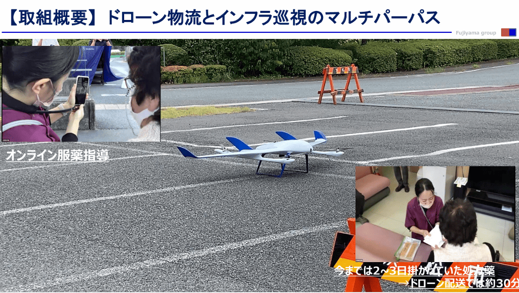 本プロジェクトでは、中山間地域への医薬品配送という物流機能に加え、河川インフラの巡視・点検や災害対応を同時に行うモデルを構築しました。