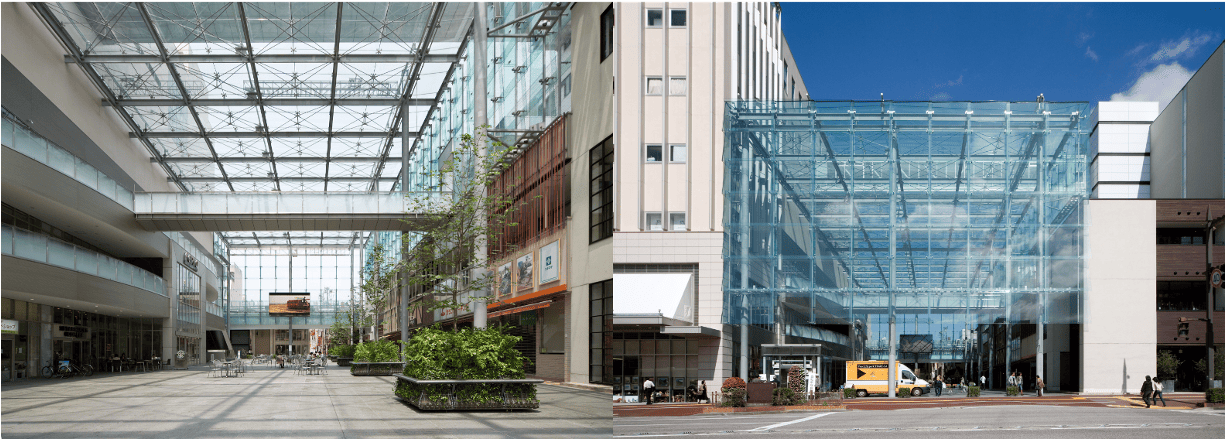 中心市街地の賑わい創出を目的に、2007年にOPENしたガラス屋根が特徴の全天候型の広場。休日稼働率は100%、平日もお昼ご飯や勉強のスポットなど、人々の集いの場となっています。広場の貸出以外にも、「エコリンク」や「ダンボールめいろ」などの自主事業に取り組み、1年を通して人と人が出会い、交流し、楽しみを見出せる拠点施設を運営しています。